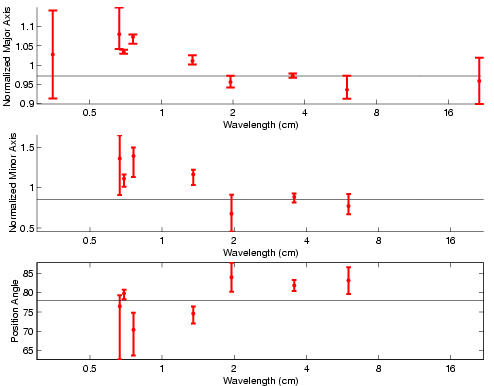 Figure 2: Major axis size, minor axis size, and position angle of elliptical Gaussian models for Sgr A* as a function of wavelength normalized by a lambda 2 scattering law (solid line, Bower et al. 2004). The deviation in the short wavelength sizes from the scattering law indicates the detection of an intrinsic source size. We include the 3.5 mm measurement in the major axis, also made with closure amplitude techniques (Doeleman et al. 2001). (Click here for a PostScript version.)
