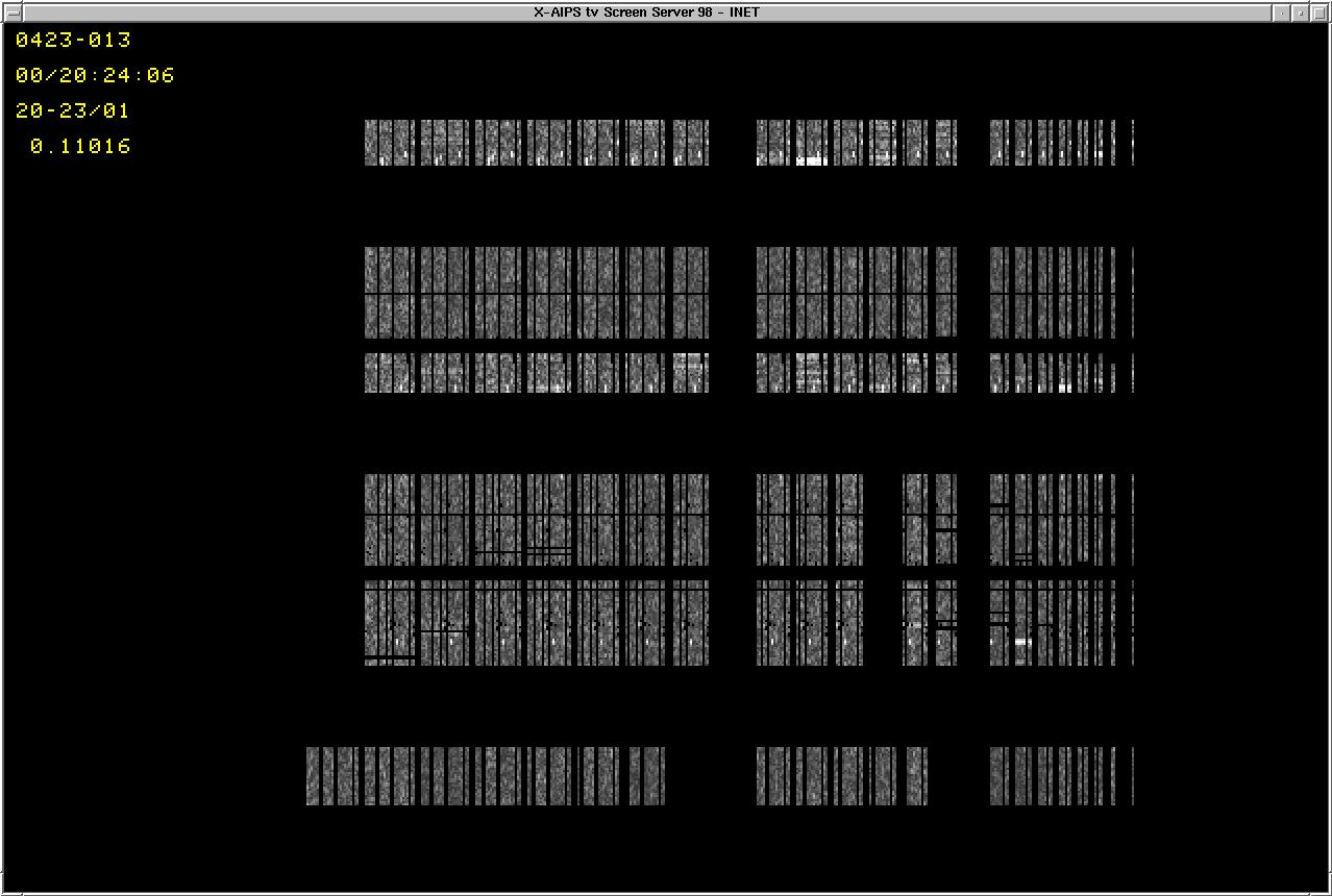 | This 22 GHz continuum data is from March 2000 showing greyscale amplitude differences between each 3.3 second integration and the running boxcar mean of 3 integrations, plotted versus time (vertical) and baseline (horizontal). Bad integrations on single antennas show up replicated on all baselines to other antennas. These errors are due to slight data dropouts due to a software timing problem in the lobe rotator (since fixed). | |||
