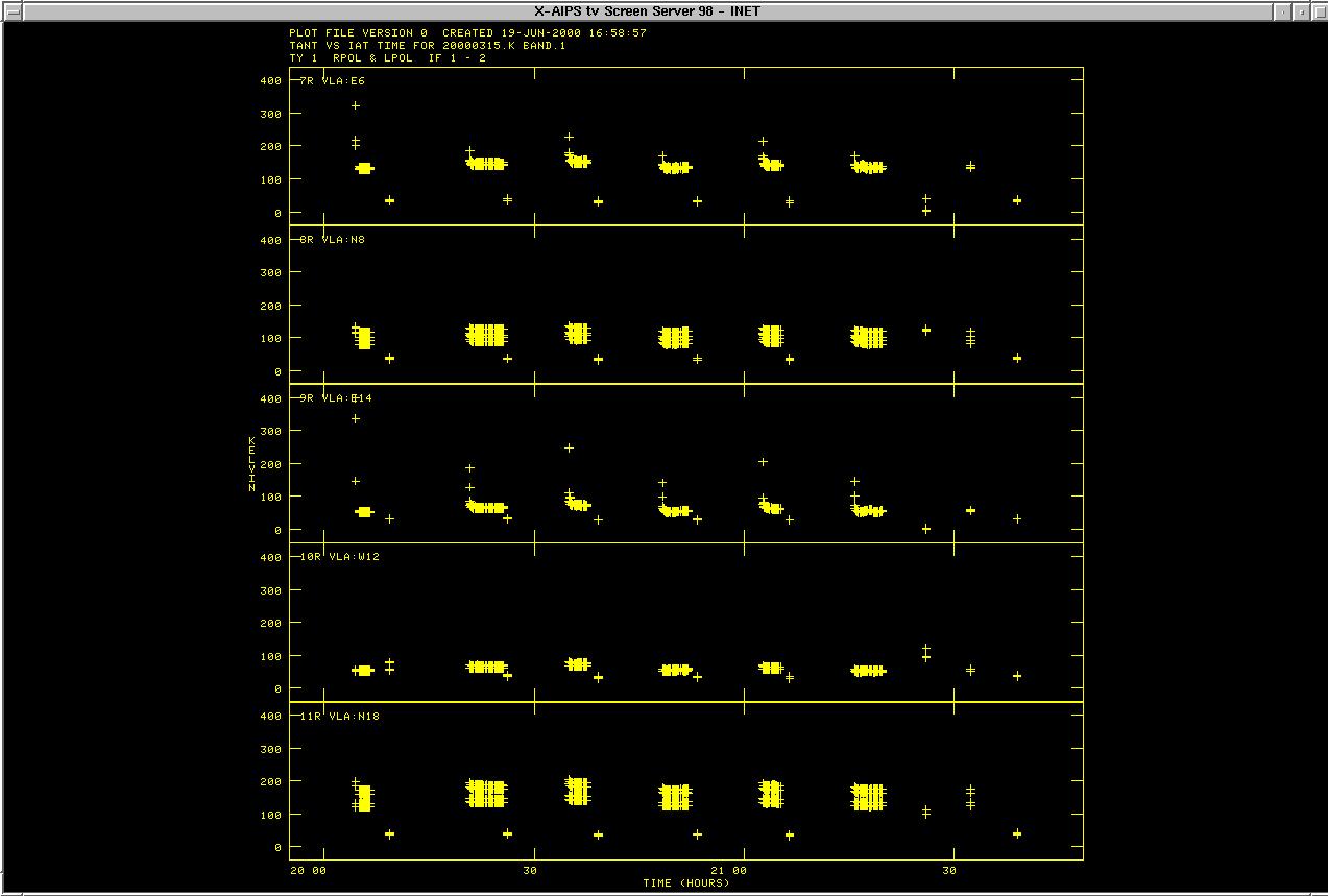 | From the same 22 GHz continuum dataset, this is a plot of the Antenna Temperature recorded by each receiver ( 2 IFs and 2 pols R/L). There are a mix of older high-noise (150K) receivers and newer low-noise (50K) receivers, but there is no sign of temperature rises due to clouds. We might consider downweighting data from the high-noise receivers! | |||