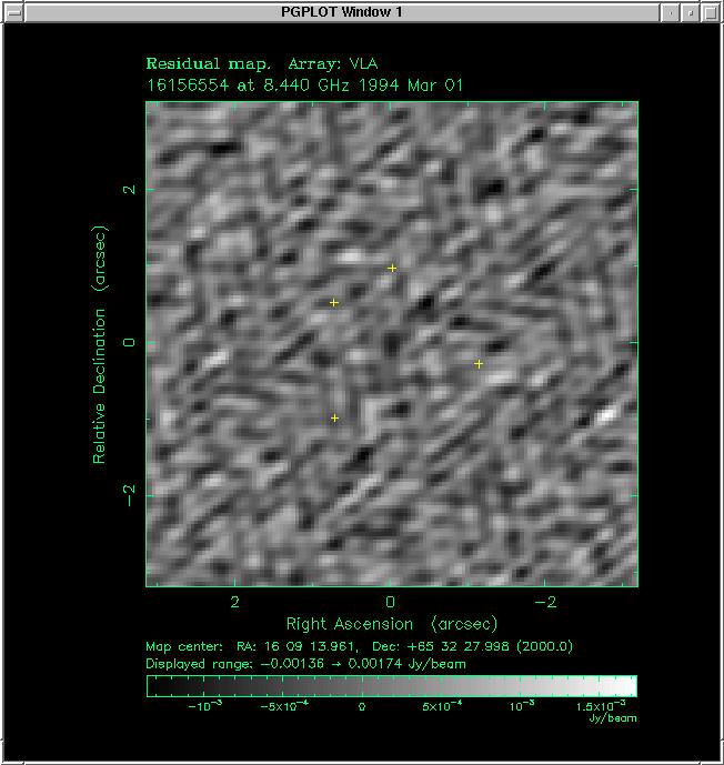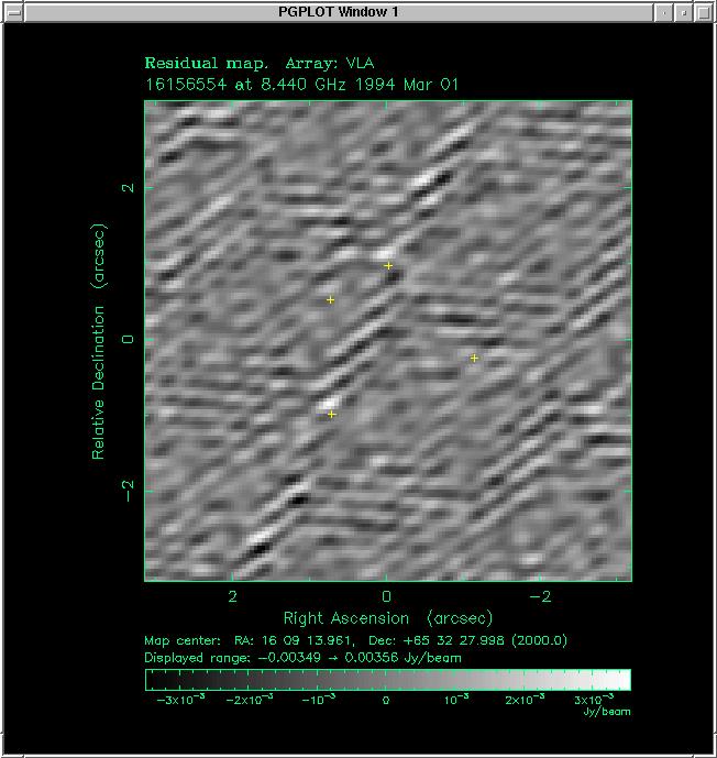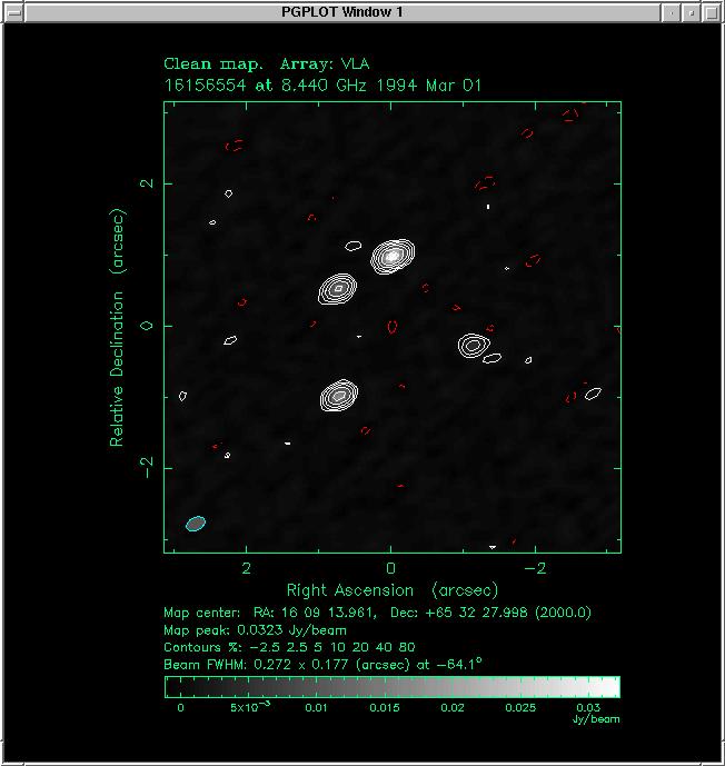 data, modelfit one last time, then restore the image. Final rms noise level - 0.4 mJy per beam! Because of strong sidelobes from the multiple componenets in this object, care must be taken in the deconvolution and self-cal iterations. In this case, modelfitting works wonders and gives us an excellent quantitative model for quadruple gravitational lens system CLASS B1608+656! | |||