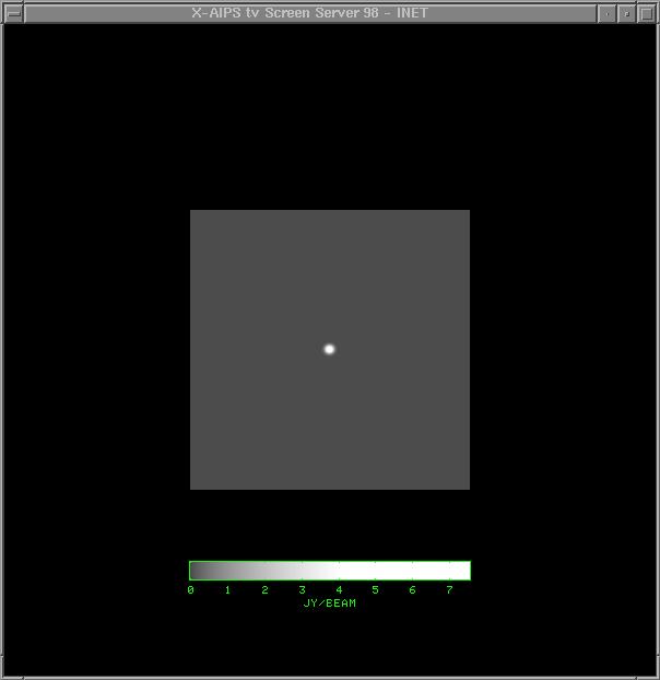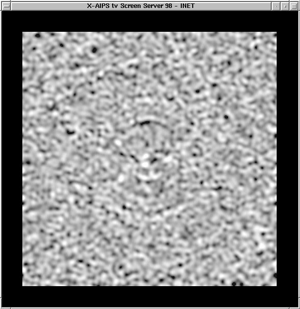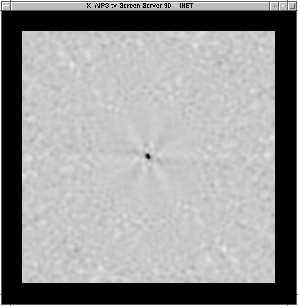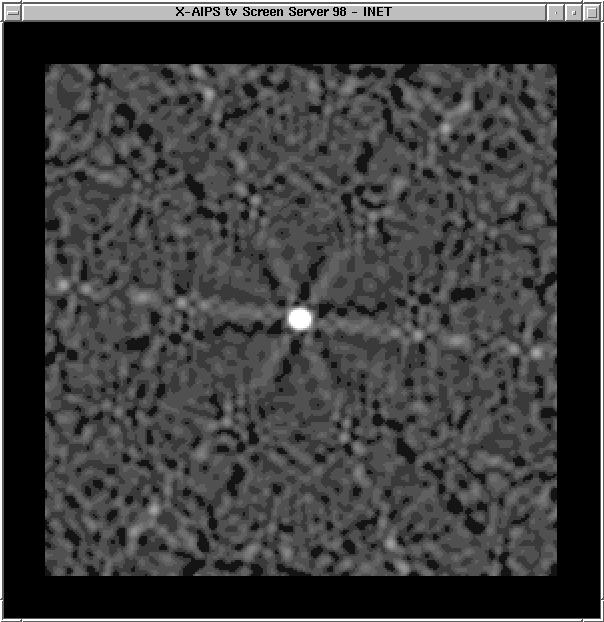 Note that there is no noise visible in the ICLN image (the noise level is a few mJy with the peak at 7.5 Jy), but the polarized emission is much weaker. Sidelobe patterns can easily be seen. Note that there is no discernable circular polarization in the VCLN image at the right, as is expected. The Q, U, and V images can be positive or negative - MEM beware! This data was processed in AIPS. | |||