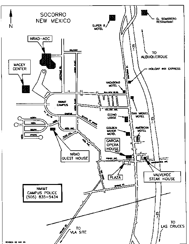 NRAO/NMT will provide vans or buses for transportation betweeen all meeting activities and those motels with rooms blocked out for the conference: Econo Lodge, Holiday Inn, Payless, and Super 8. The cost of this transport is covered by the registration fee. Note that this includes travel to/from the VLA 20th Anniversary Party and to/from the scheduled hikes.