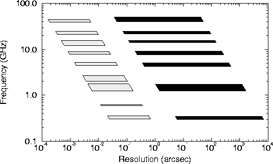 There is a serious gap in coverage between the 35-km longest baseline of the VLA and the 200-km shortest baseline of the VLBA. This gap is well illustrated in the frequency-resolution plot shown in Figure 2.6.
