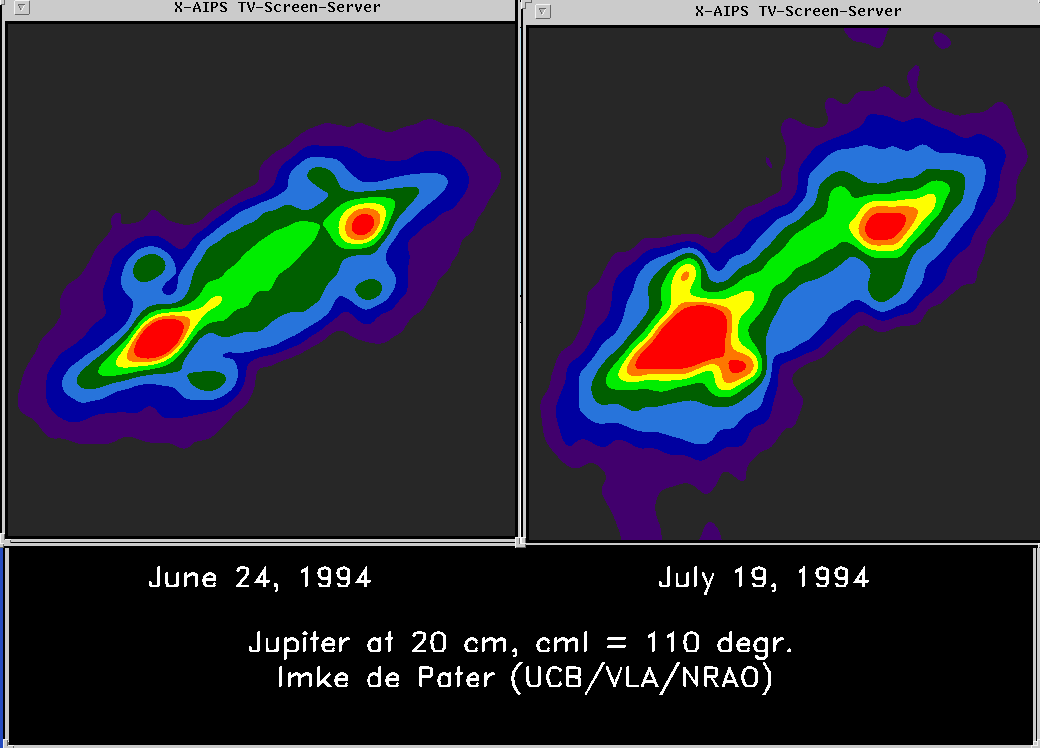 This pair of images shows the planet Jupiter before (left) and after (right) fragments of the comet Shoemaker-Levy 9 struck the planet in 1994. The disk of the planet is in the center of the images. The bright red spots are regions high above Jupiter's "surface" where electrons interacting with the planet's intense magnetic field are producing strong radio emission. These "radiation belts" are similar to the Van Allen Radiation Belts discovered above the Earth in 1958. The pair of images shows the effect of the comet impacts on this pattern of radio emission.