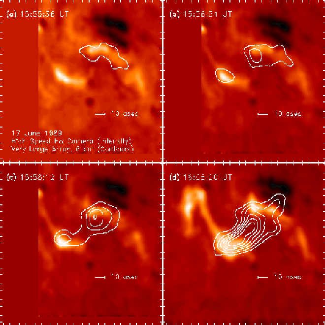 These four images are combined radio-optical images of a large solar flare that occurred on 17 June 1989. The red-orange background images are optical images (H-Alpha) and the superimposed contours show radio emission as seen with the VLA at a wavelength of 4.9 GHz. The four images are from four different times during the event, showing the progression toward maximum radio emission (bottom right). This soft X-ray flare was accompanied by a coronal mass ejection.
