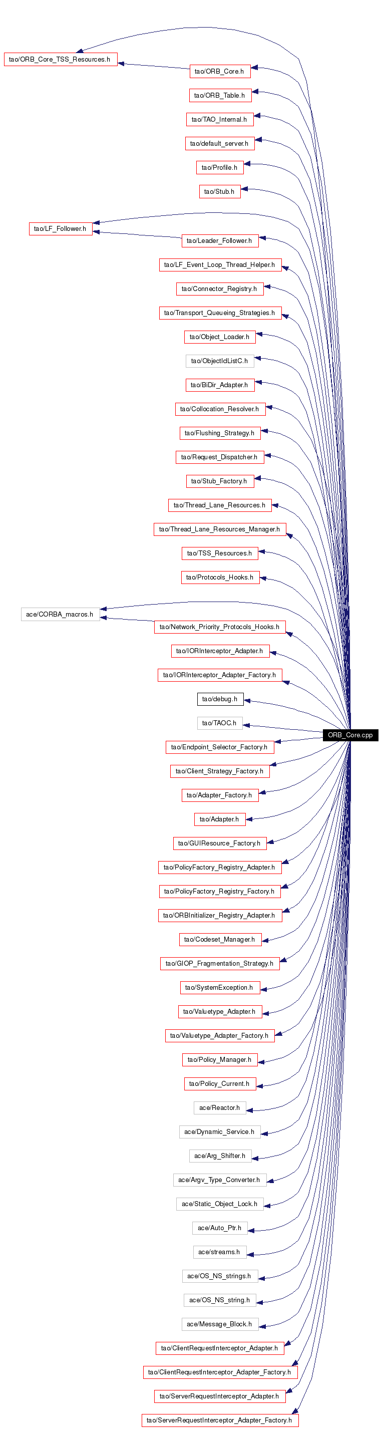 #include "tao/ORB_Core.h"#include "tao/ORB_Core_TSS_Resources.h"#include "tao/ORB_Table.h"#include "tao/TAO_Internal.h"#include "tao/default_server.h"#include "tao/Profile.h"#include "tao/Stub.h"#include "tao/LF_Follower.h"#include "tao/Leader_Follower.h"#include "tao/LF_Event_Loop_Thread_Helper.h"#include "tao/Connector_Registry.h"#include "tao/Transport_Queueing_Strategies.h"#include "tao/Object_Loader.h"#include "tao/ObjectIdListC.h"#include "tao/BiDir_Adapter.h"#include "tao/Collocation_Resolver.h"#include "tao/Flushing_Strategy.h"#include "tao/Request_Dispatcher.h"#include "tao/Stub_Factory.h"#include "tao/Thread_Lane_Resources.h"#include "tao/Thread_Lane_Resources_Manager.h"#include "tao/TSS_Resources.h"#include "tao/Protocols_Hooks.h"#include "tao/Network_Priority_Protocols_Hooks.h"#include "tao/IORInterceptor_Adapter.h"#include "tao/IORInterceptor_Adapter_Factory.h"#include "tao/debug.h"#include "tao/TAOC.h"#include "tao/Endpoint_Selector_Factory.h"#include "tao/Client_Strategy_Factory.h"#include "tao/Adapter_Factory.h"#include "tao/Adapter.h"#include "tao/GUIResource_Factory.h"#include "tao/PolicyFactory_Registry_Adapter.h"#include "tao/PolicyFactory_Registry_Factory.h"#include "tao/ORBInitializer_Registry_Adapter.h"#include "tao/Codeset_Manager.h"#include "tao/GIOP_Fragmentation_Strategy.h"#include "tao/SystemException.h"#include "tao/Valuetype_Adapter.h"#include "tao/Valuetype_Adapter_Factory.h"#include "tao/Policy_Manager.h"#include "tao/Policy_Current.h"#include "ace/Reactor.h"#include "ace/Dynamic_Service.h"#include "ace/Arg_Shifter.h"#include "ace/Argv_Type_Converter.h"#include "ace/Static_Object_Lock.h"#include "ace/Auto_Ptr.h"#include "ace/CORBA_macros.h"#include "ace/streams.h"#include "ace/OS_NS_strings.h"#include "ace/OS_NS_string.h"#include "ace/Message_Block.h"#include "tao/ClientRequestInterceptor_Adapter.h"#include "tao/ClientRequestInterceptor_Adapter_Factory.h"#include "tao/ServerRequestInterceptor_Adapter.h"#include "tao/ServerRequestInterceptor_Adapter_Factory.h"Include dependency graph for ORB_Core.cpp: