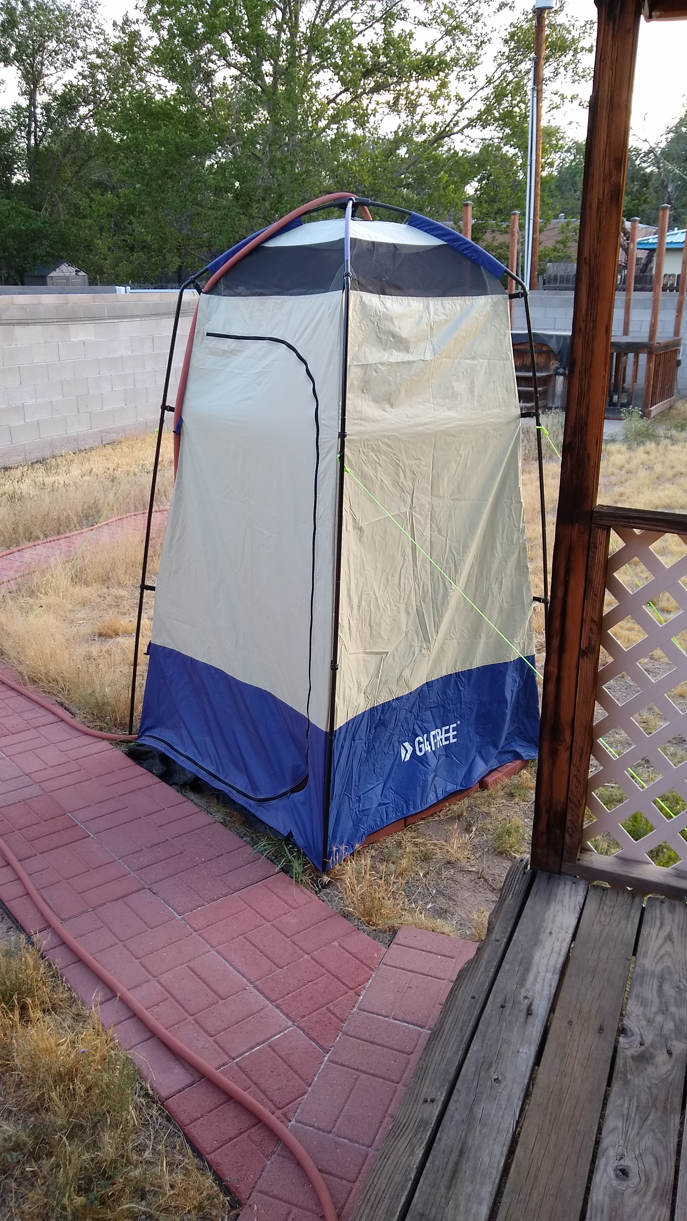 In planning for not having a shower, I purchased a cheap outdoor shower and installed it in my back yard with a garden hose. It worked pretty well. The water even got too hot depending on the time you used it. The shower lasted just under four months when one side of it ripped open and then the unit collapsed. I was hoping to get a little more time out of it but oh well.