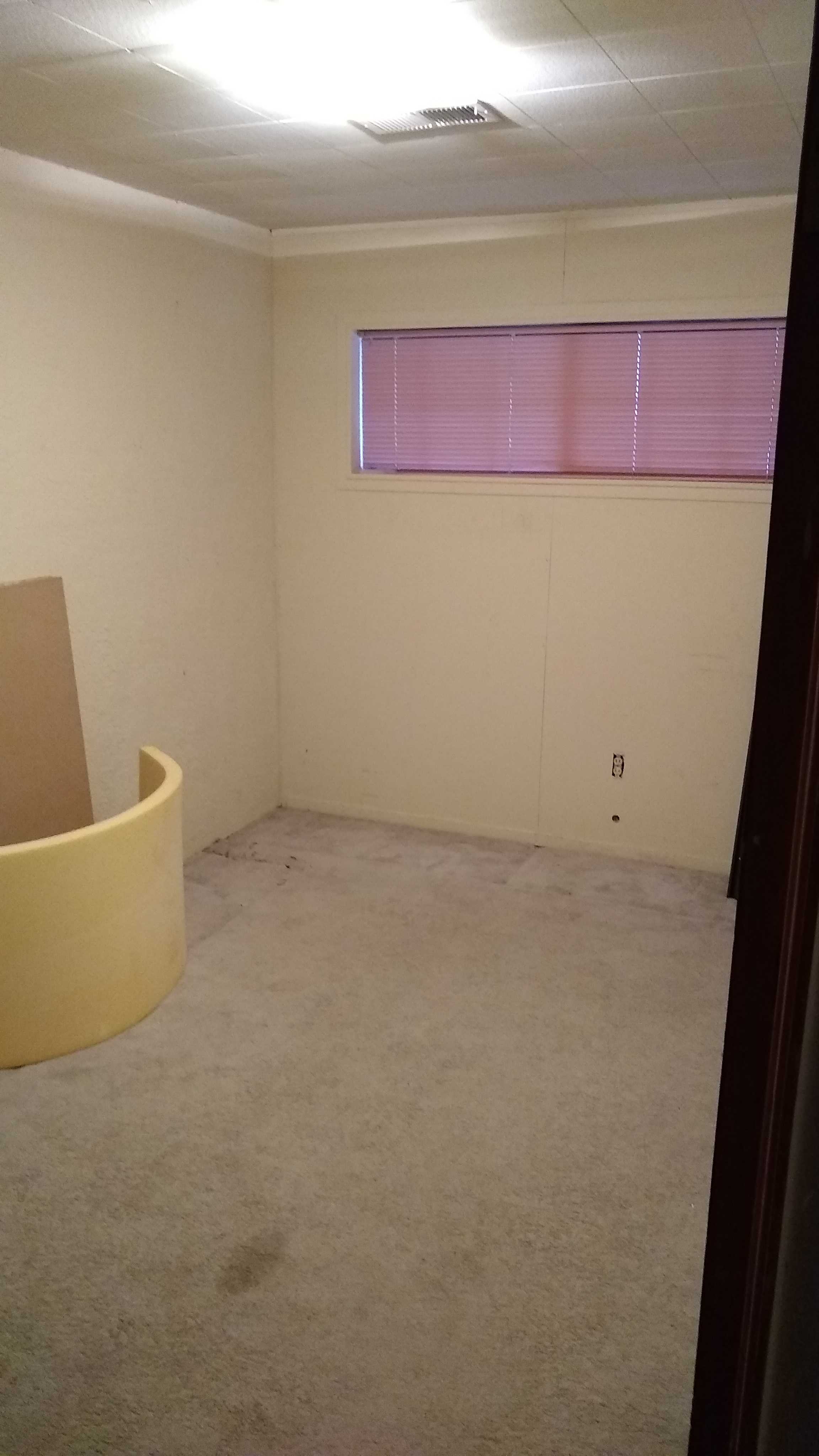 I removed the carpet. Then a great friend helped me remove all the rock wall (plaster on top of drywall). Then I removed the ceiling tiles and wall insulation. As in the danger room, the insulation in the walls was 2.5" rock wool from Pueblo, CO. I also learned that some of the subfloor had been replaced with OSB. Perhaps there was a waterbed incident?