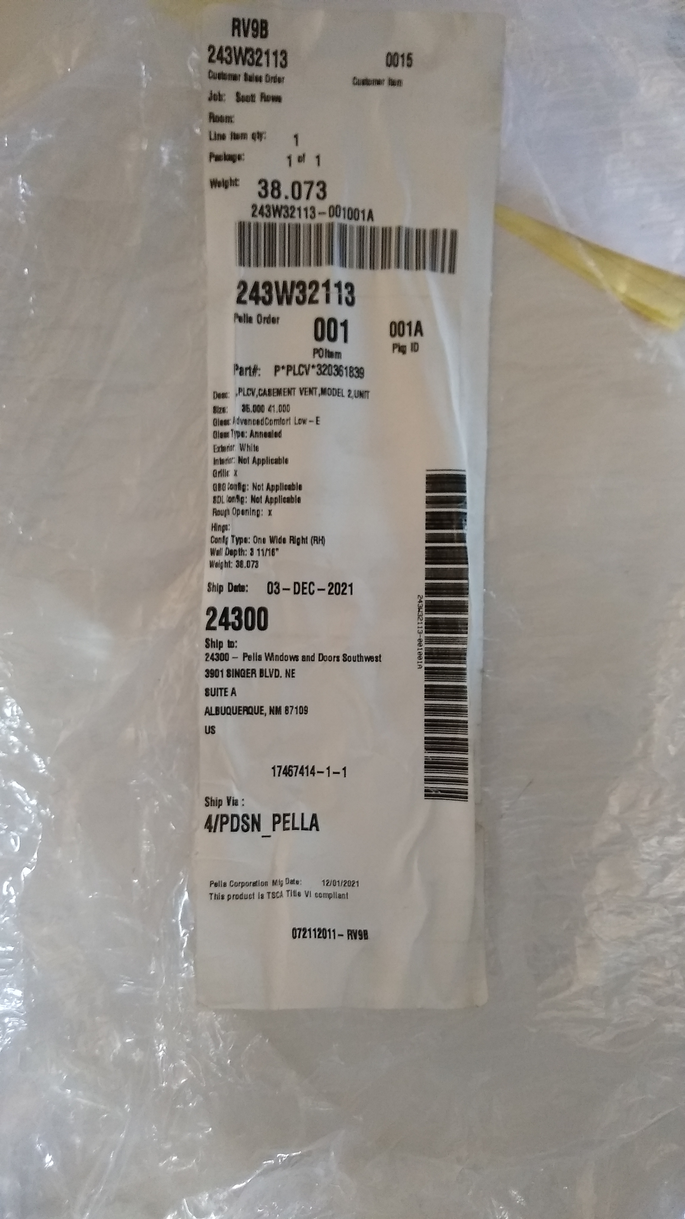 I purchased another 35in X 41in, dual-pane, high-altitude, casement window from Pella's Lifestyle series. This matches the one in the Master Bed Room.