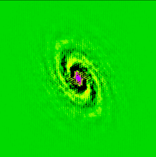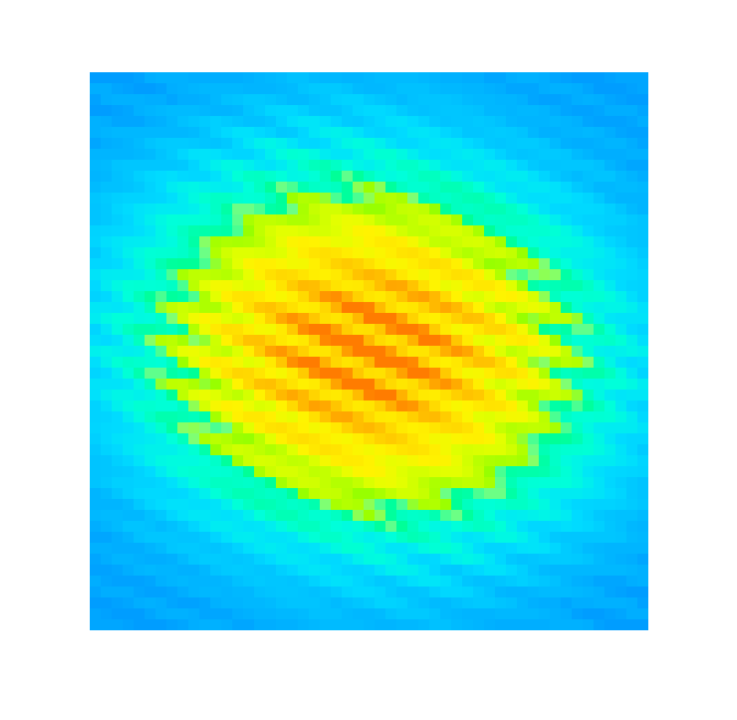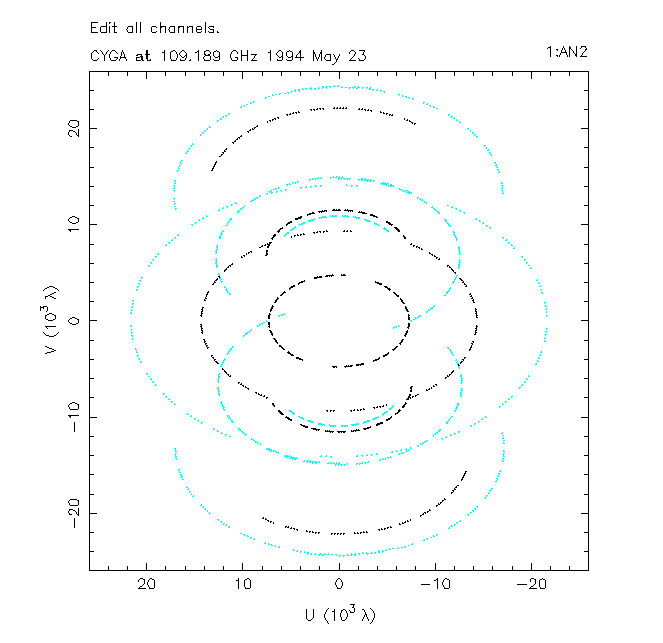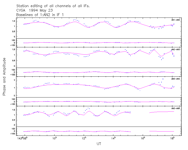 | The visibility plot for AN2. Blue dots are the actual measured amplitude and phase from the interferometer while the red line is the model visibility derived from the image shown above. |