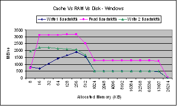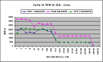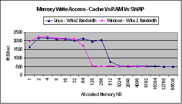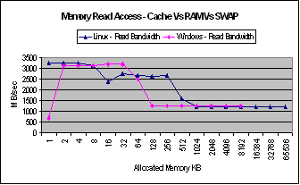 As excepted there is a considerable drop in bandwidth for both memory read and write for both Linux and Windows when the size of the allocated memory is nearly the same as the cache size. In both cases of read and write the bandwidths of Windows drops much earlier than Linux.