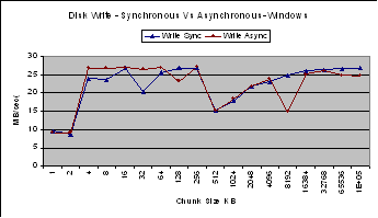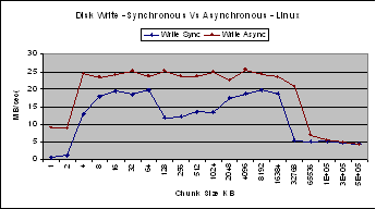 The performance for synchronous and asynchronous writes are comparable for Linux and Windows.