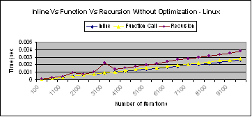 28 : Graphs for Inline Vs Function Vs Recursion calls on Linux
