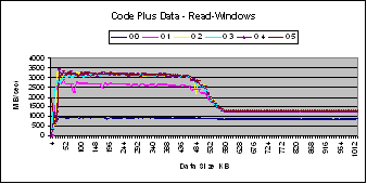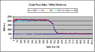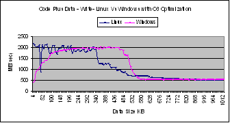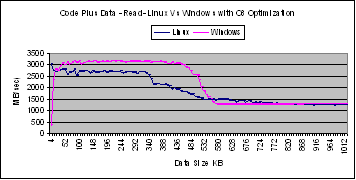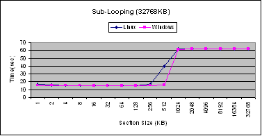 These graphs show that performance of Linux and Windows are comparable for this experiment. The main difference is that the performance of Linux degrades before the chunk size is equal to the size of the cache. This could be due to the presence of other resident code in the Linux cache.