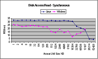 In the case of synchronous reads, Linux performs better than Windows. The bandwidth of Linux drops way beyond the size of the cache while there is drop in bandwidth for Windows at this point.
