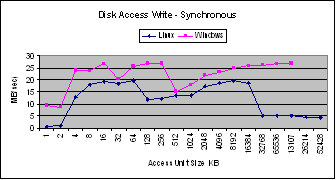 The bandwidth for synchronous writes drops for Windows at the cache size while that for Linux drops before the cache size. Windows performs better than Linux for synchronous writes at any size. Beyond the size of the cache, the performance of Windows continues to prove while that of Linux goes down.