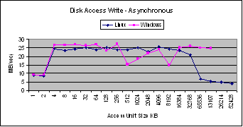 The performance of asynchronous writes for Linux and Windows are comparable except when there is a drop in bandwidth for Windows at the cache size.