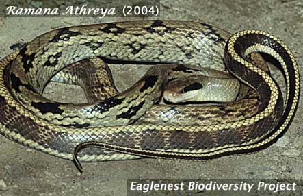 Herpetofauna of W. Arunachal Pradeshchecklistby Ramana AthreyaPage content :Snake list Lizard list Amphibian list References Link to Herp image pages In the lists below : column 1 : lists the name, column 2 : Pakke record (P) column 3 : Eaglenest record (E) column 4 : recorded elsewhere in W. Arunachal (B : below Bomdila) column 5 : Eaglenest Biodiversity Project record (i.e. during Nov 2003 - Dec 2004) and column 6 : Remarks, including code for brief notes (notes listed below the table) and IUCN redlist status. Snakes